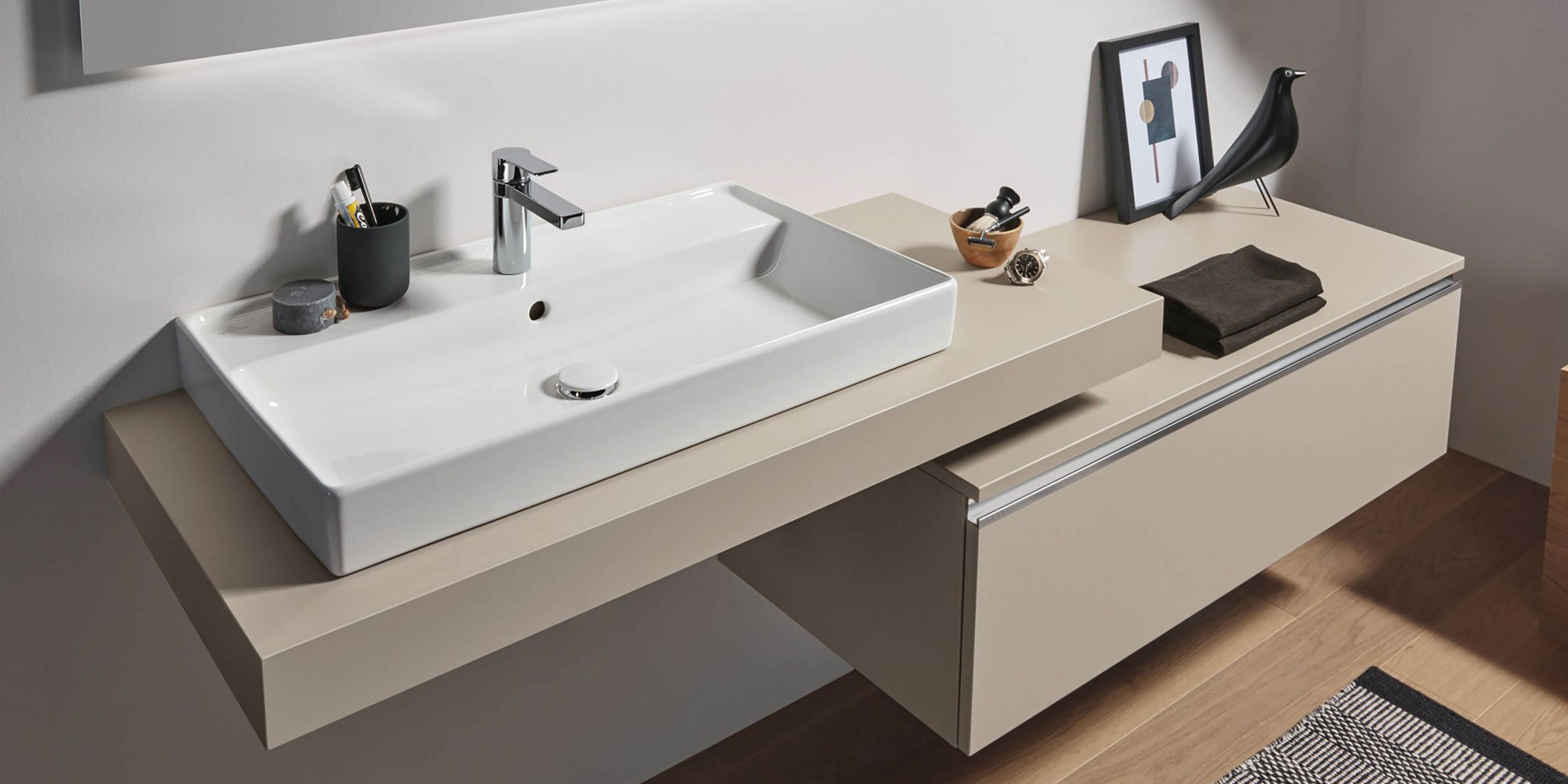 2morrow bietet ein flexibles Baukastensystem für die individuelle Badgestaltung. Die Basis bildet eine elegante, variable Platte in sechs Ausführungen, die als Fundament für Aufsatzwaschtische dient. Dieses System wird ideal durch Unterschränke, Anbauschränke und Regale ergänzt, die vielfältigen Stauraum schaffen.