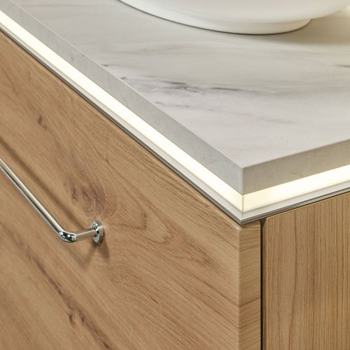 Ambiente besonders freundlich und überzeugt mit seinem Platzangebot. Breitenvariables Regal mit Melamineinlegeboden ist in individueller Breite bestellbar und ermöglicht zusammen mit den Schränken einen Waschplatz nach Maß oder auch den passgenauen Einbau eines Möbels in Nischen Sanfte Beleuchtung und aufgeräumte Ruhe.