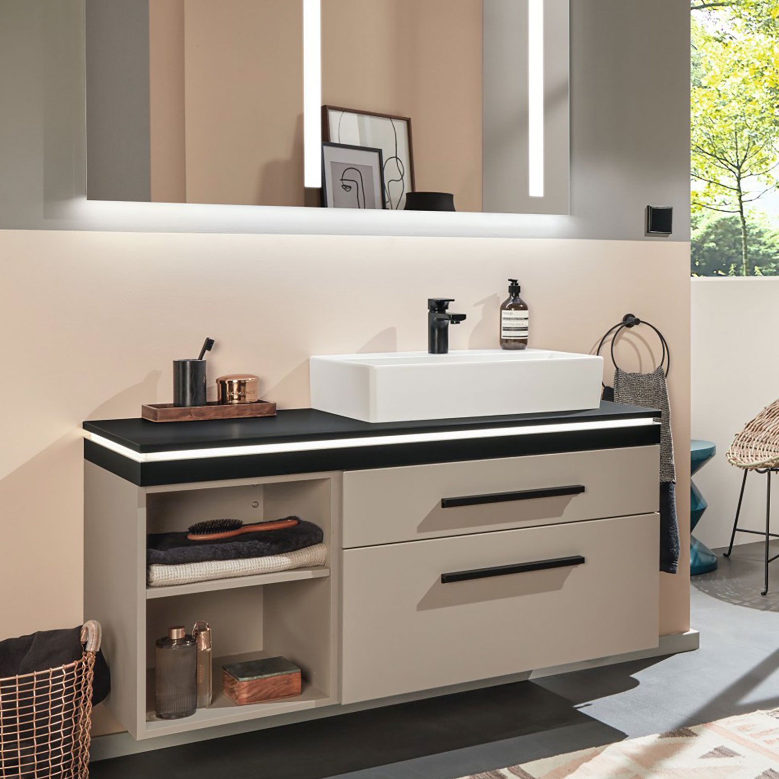 Das geräumige Solitärmöbel in Sandgrau-Matt und die gleichfarbige 2morrow Platte Classic ergänzen sich optimal. Die schwebende, asymmetrische Anordnung sorgt für Stauraum mit großzügigen Ablageflächen und erzeugt dabei eine Leichtigkeit, die durch den Reflection Lichtspiegel LUCA noch unterstützt wird. Zusammen mit platzsparenden Cubes in Kontrastfarbe entsteht eine moderne Badlösung.